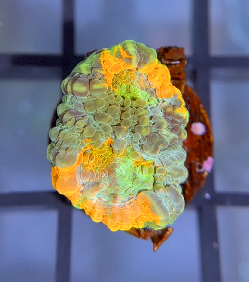 The Acid Trip Echinata is an insane acan thats gets a wide variety of different colors. The mouth gets a bright orange with green streaks through it. This is an easier coral to grow.