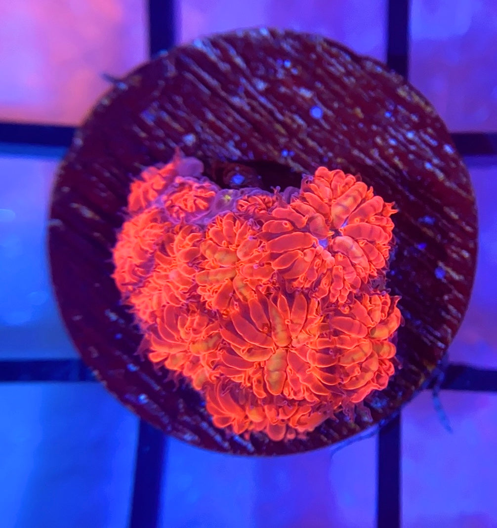 Classic Blastomussa merleti that is bright red with a blue mouth. Very bright blasto that prefers low light and low flow. Great for beginners.