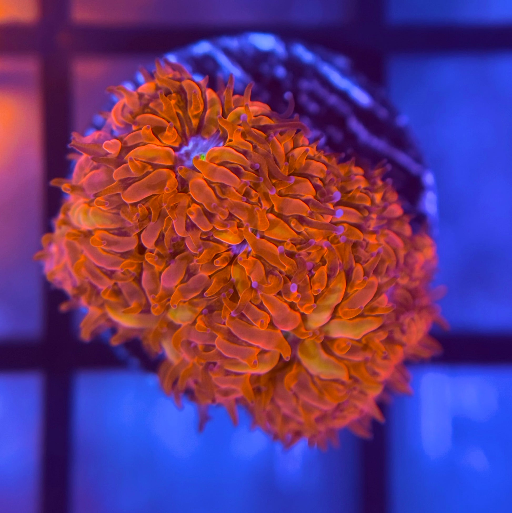 Classic Blastomussa merleti that is bright red with a blue mouth. Very bright blasto that prefers low light and low flow. Great for beginners.