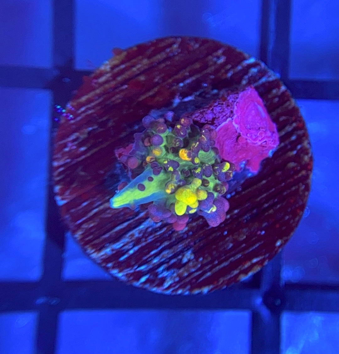 The CB Fire Shroom is a truly rainbow bounce mushroom. This coral gets red, orange, purple, and yellow vesicles. These mushrooms can get big, some individual polyps stretching over 4+ inches! This is a wonderful addition to any mushroom collection.