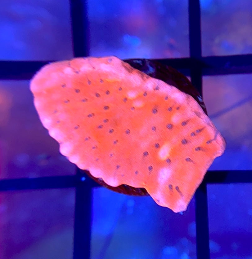 This is one of the fastest growing high-end montis. It can encrust or plate. In lower light this monti is mainly orange/red in color, while in high light it can be a bright pink.