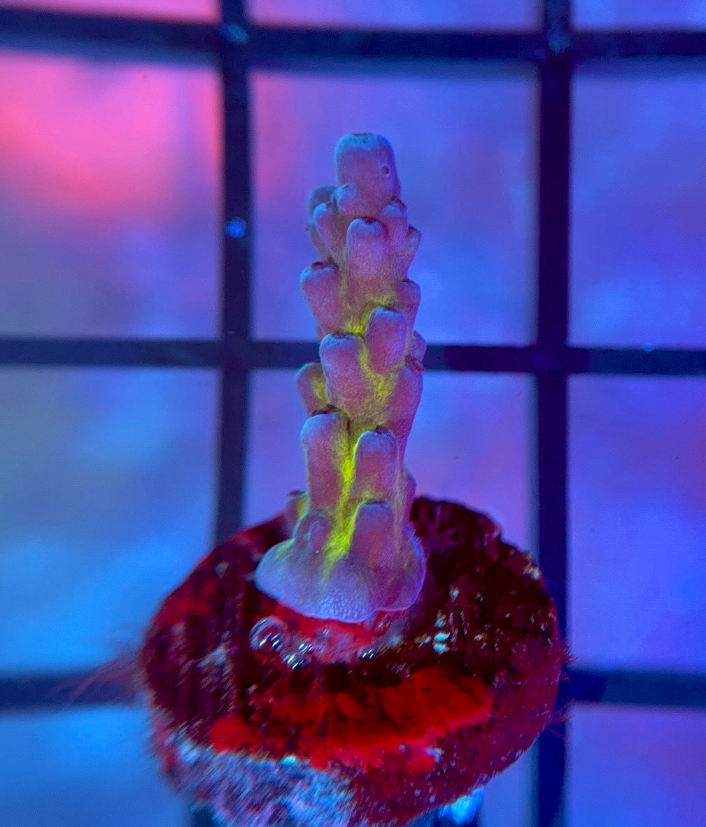 The CB Purple Planet is a very unique acropora that has a dark blue/purple coloration with a green base and polyps. This acro is similar to a cali tort although it has a deeper purple coloration with a different growth stye.