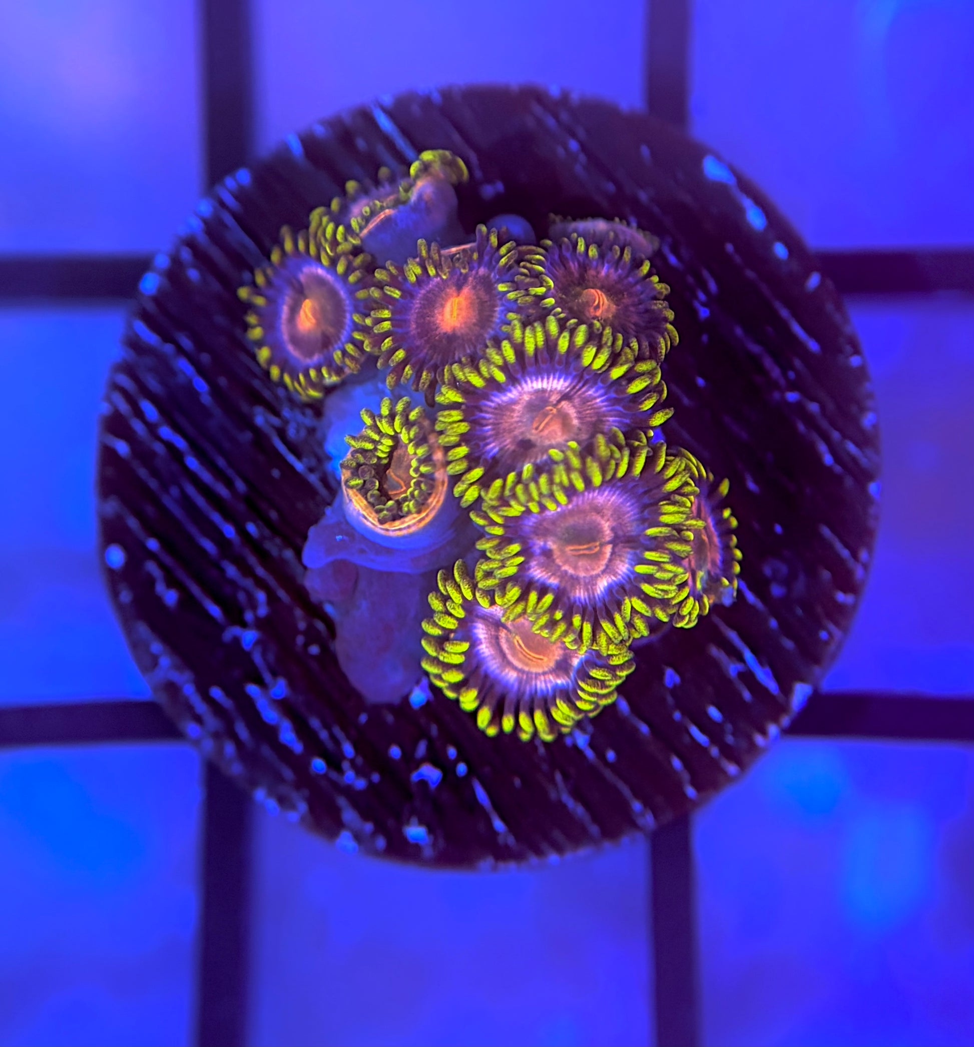 Vibrant yellow face with a bright green skirt. These zoas are fast growing and do better for us under high light and medium flow.