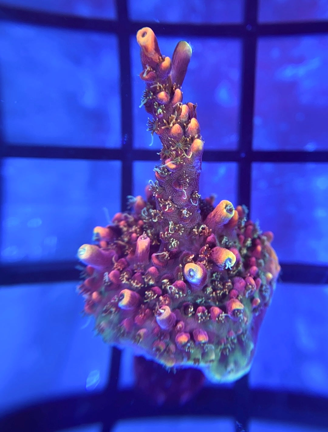 The CC Voodoo Majick is a beautiful orange acropora with long whispy green polyps. This acro prefers very high light and high flow.