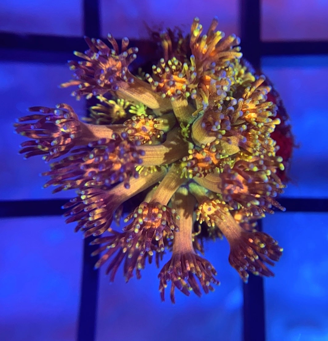 The Grand Master Goni is one of the nicest and most desirable goniopora in the hobby. This incredible piece is a bright orange with green tints. This is one of the hardiest high-end gonis, and it prefers high light and medium to low flow.