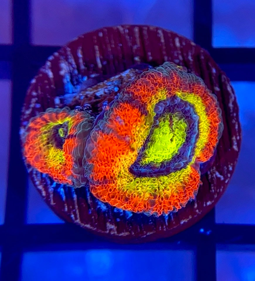 The Holy Grail Micro is a fast-growing and highly desirable micromussa. This piece has. a yellow mouth surrounded by an outer red ring. It is extremely bright and is a hardy piece, perfect for beginners and high-end collectors.