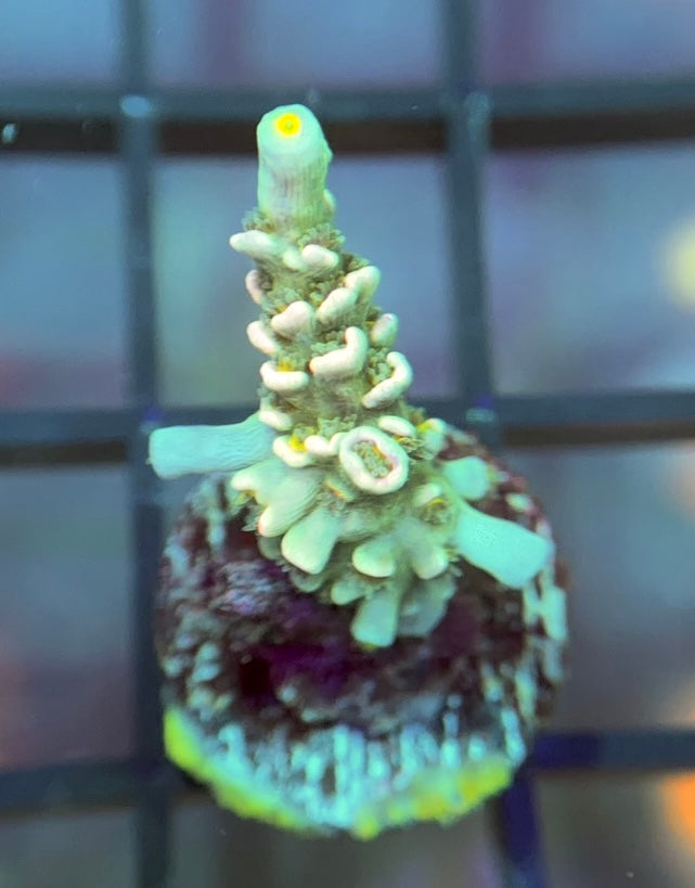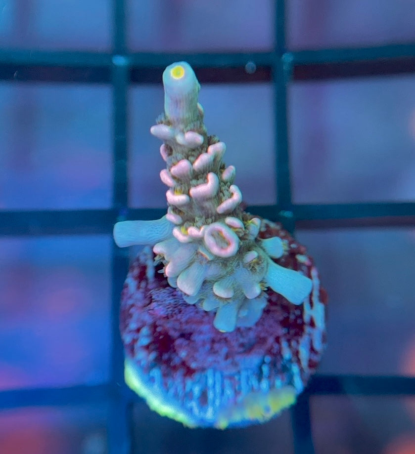 The MattV Time Machine Tenuis is one of the nicest high-end acros with it's purple corallites and pink/purple polyps. It can also develop yellow accents all around the coral. It gets a green base that can also develop blues and oranges depending on light availability.