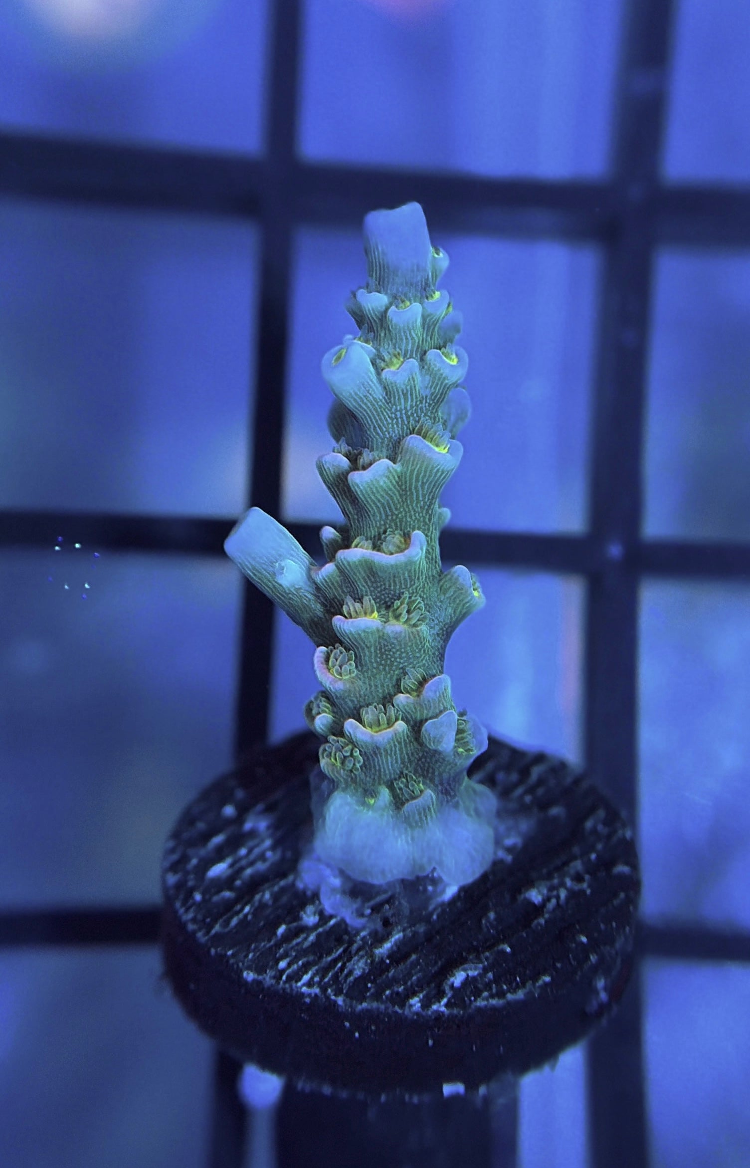 The MattV Time Machine Tenuis is one of the nicest high-end acros with it's purple corallites and pink/purple polyps. It can also develop yellow accents all around the coral. It gets a green base that can also develop blues and oranges depending on light availability.