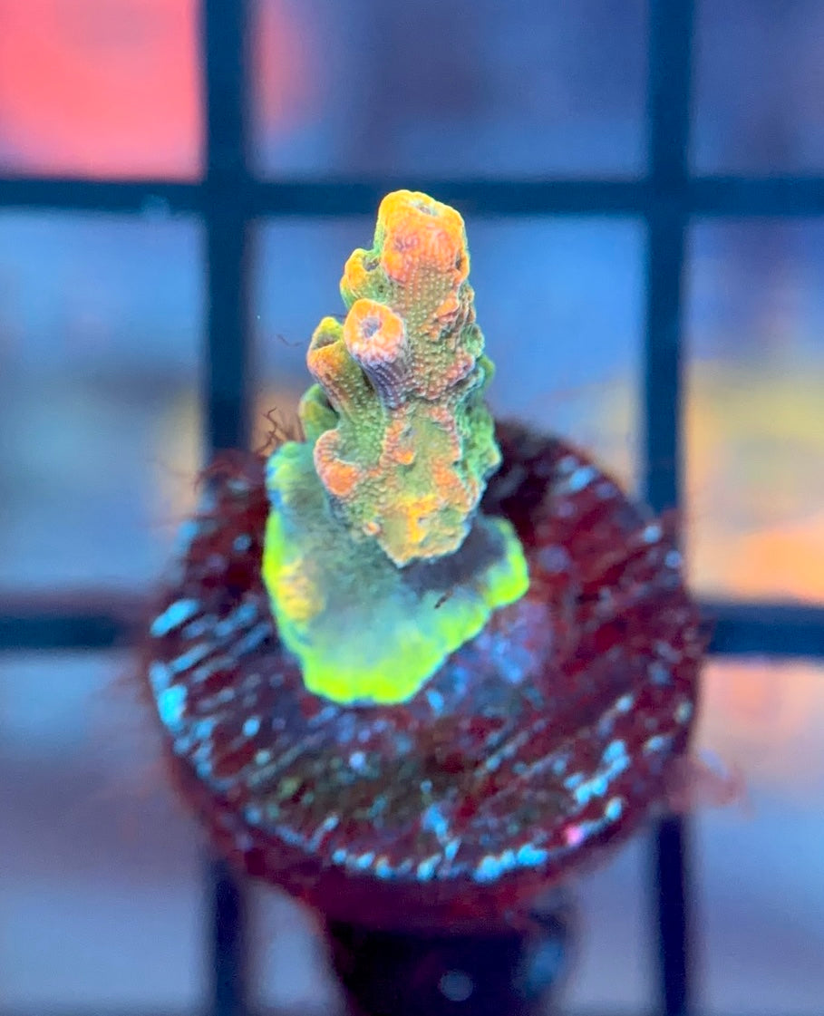 The POTO Side Chick Acro has green polyps with purple corallites. This is a tabling acro and makes for a beautiful colony.