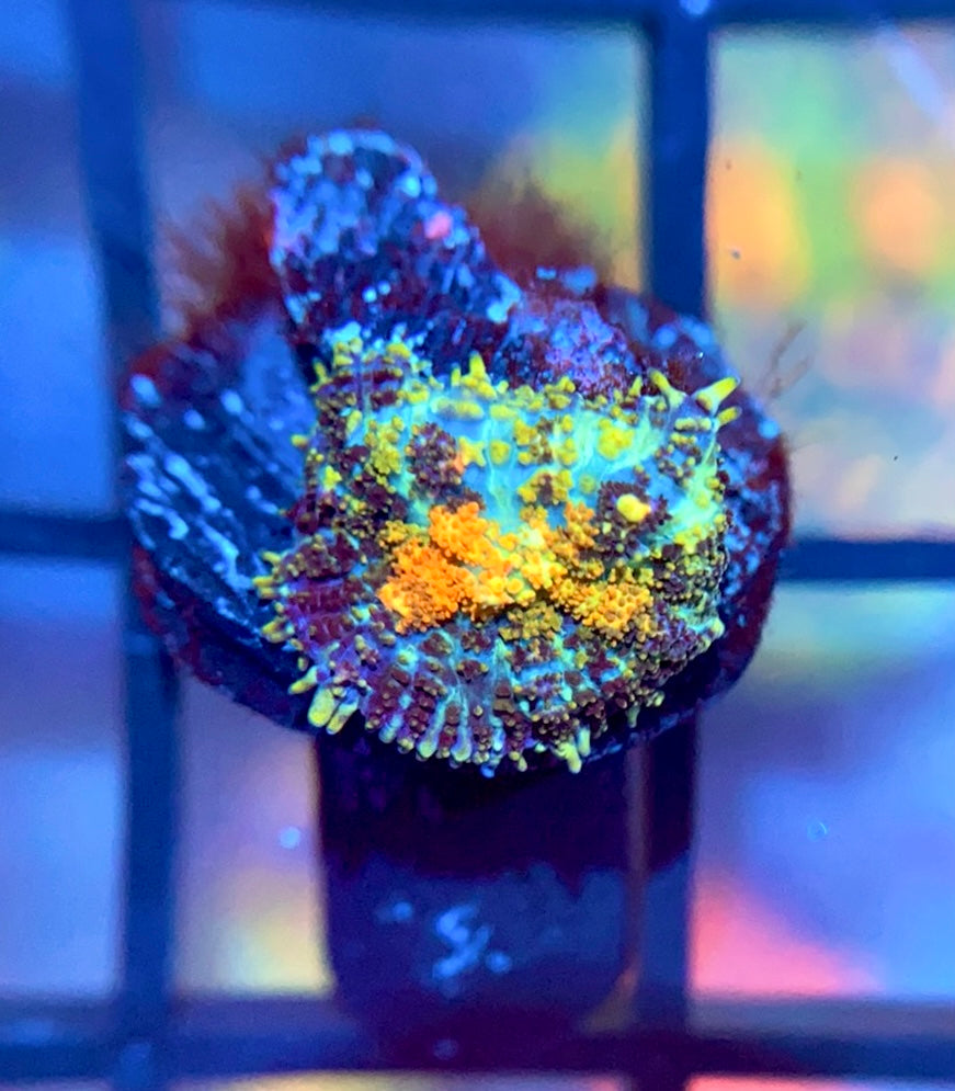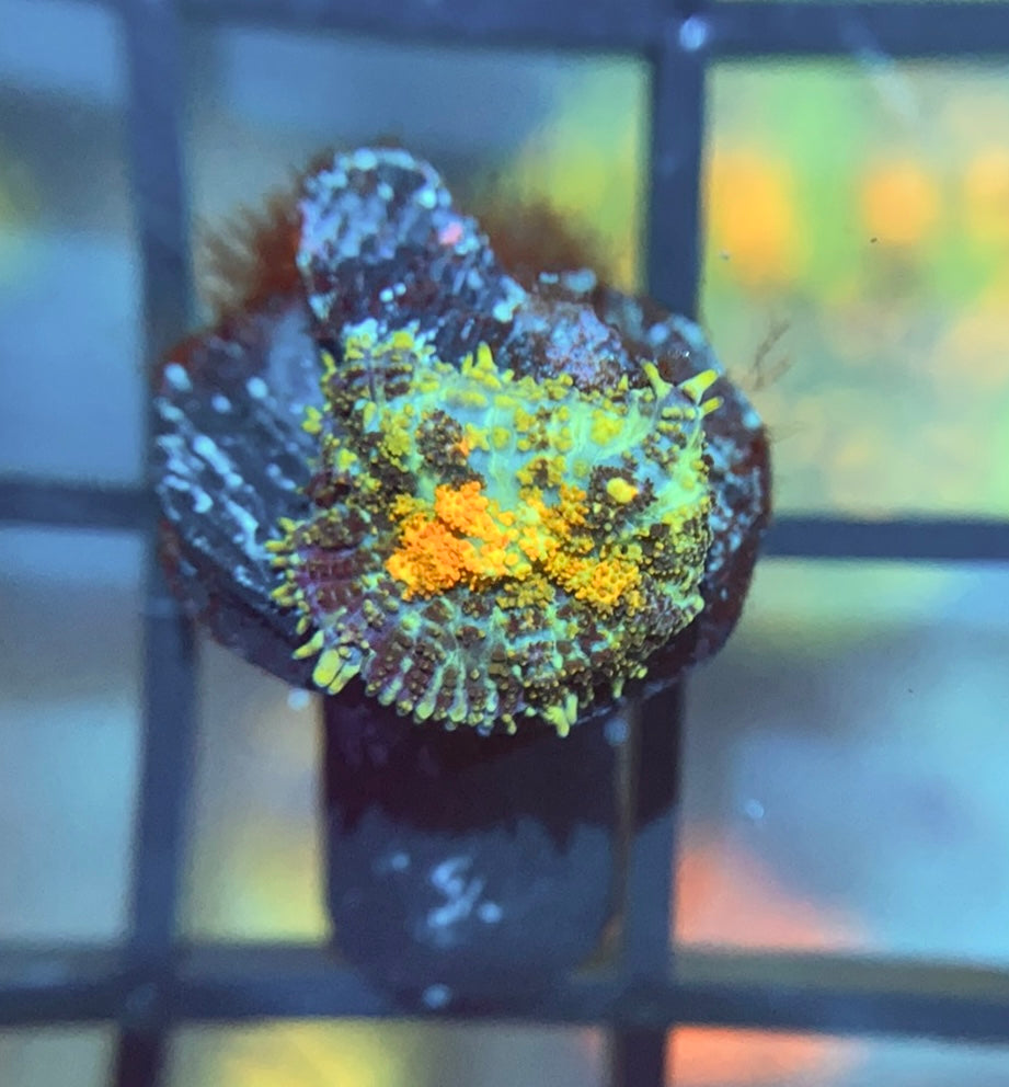 The Powerball Bounce Mushroom is one of the nicest bounce mushrooms in the hobby. This incredible rhodactis sports extremely colorful and large bounces, and various smaller bounces that pop up as well. These mushrooms do not get large, and are a fantastic addition to any collection.