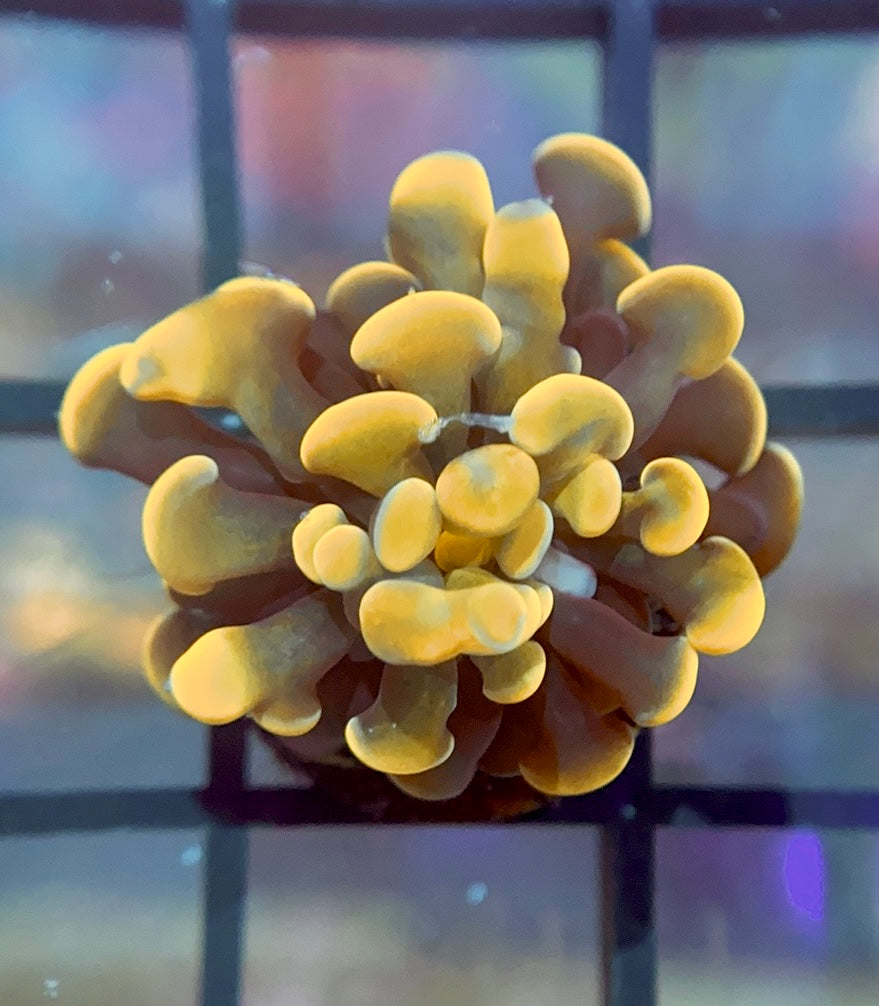 The Reef Regeneration Cinnamon Swirl is a branching hammer that is a dark orange coloration and some purple tentacles. This is a great collectors piece as it is a unique color unlike the common gold hammers.
