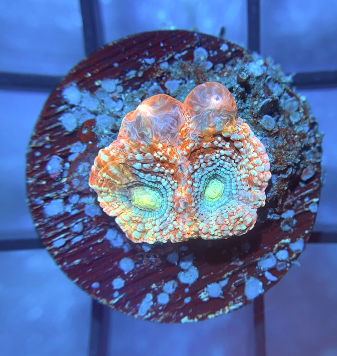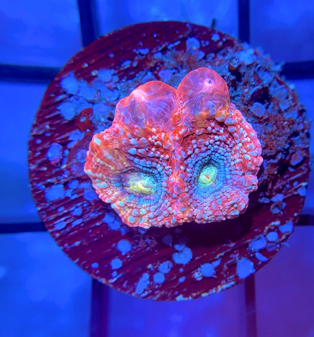 The RRG Confetti Master Bower is an extremely special bowerbanki. This incredible piece has extremely colorful baby polyps, with a pinwheel of rainbow colors. Mature polyps are dark gray/blue with a bright red/orange skirt and a deep green mouth. A true collectors piece.