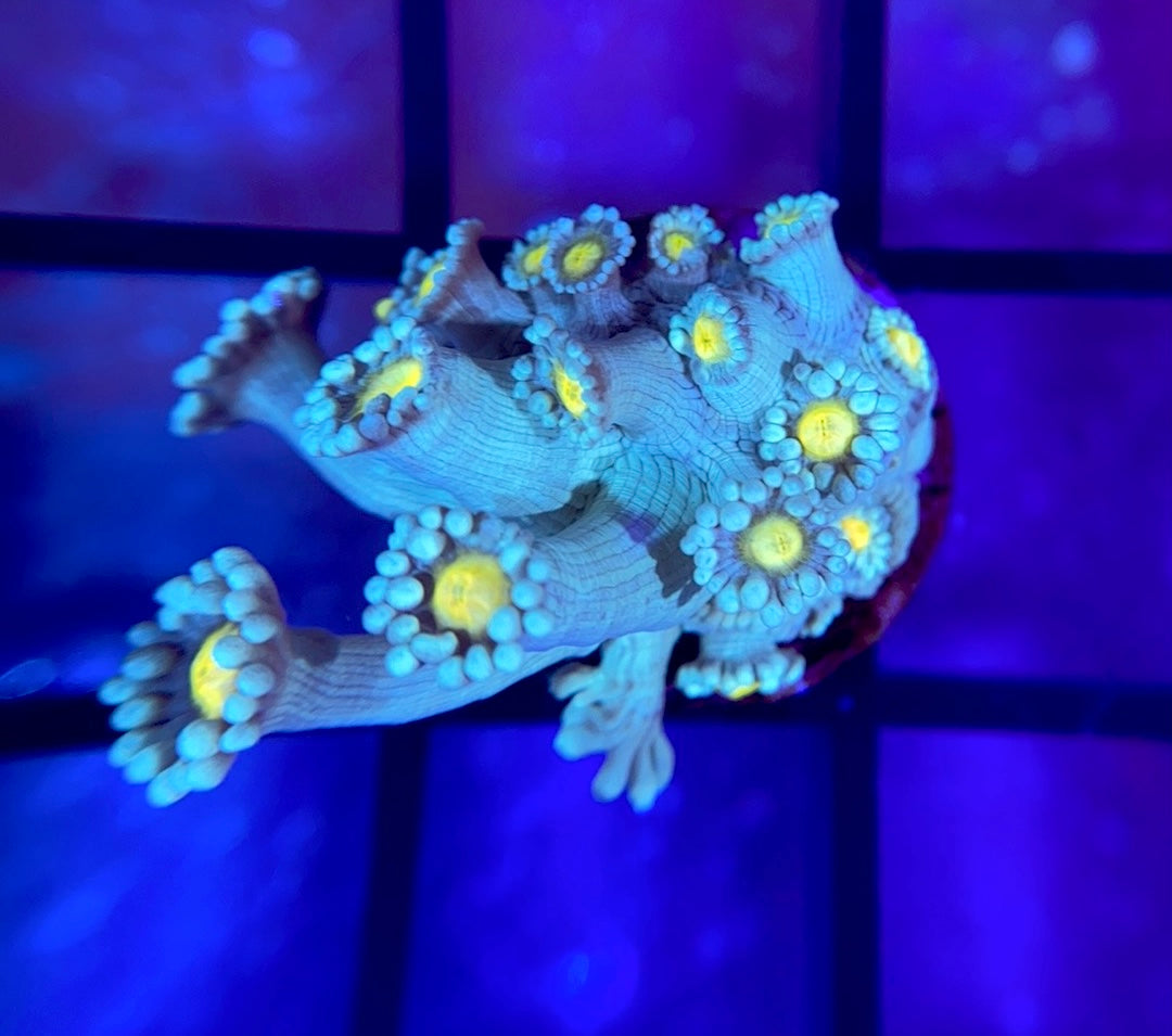 The Reef Regeneration Jack Frost Goni is a beautiful blue goni with yellow mouths. We do believe this is the OG LC Jack Frost Goni, however we do not have direct lineage and therefore do not claim it is from LC.