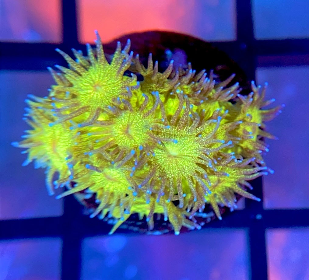 The Reef Regeneration Leprechaun Dust Glitter Goni is an extremely unique green glitter goniopora with bright orange mouths. This piece is unlike any glitter goniopora we have seen. Prefers lower light and medium/high flow.