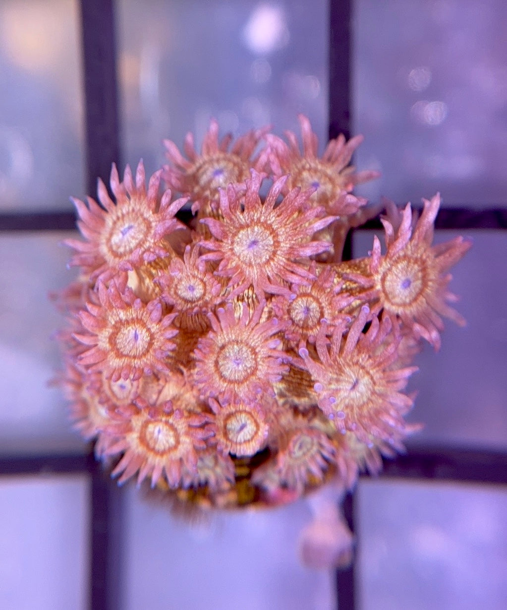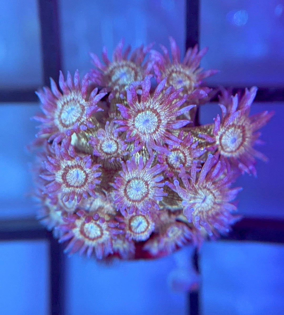 The Reef Regeneration Purple Glitter Goni has been aquacultured for years, it is extremely dark purple/blue and has the glitter pattern both on the face and stalk of each polyp. Last photo is the mother colony, photographed in pure white led lights.