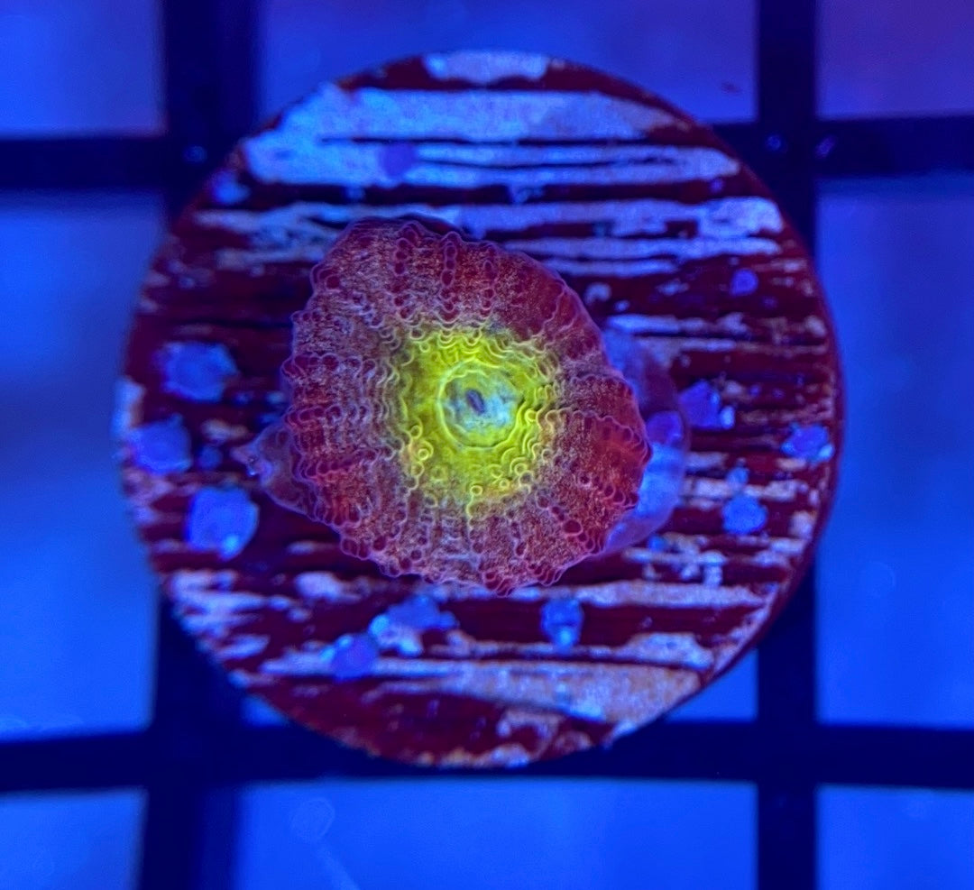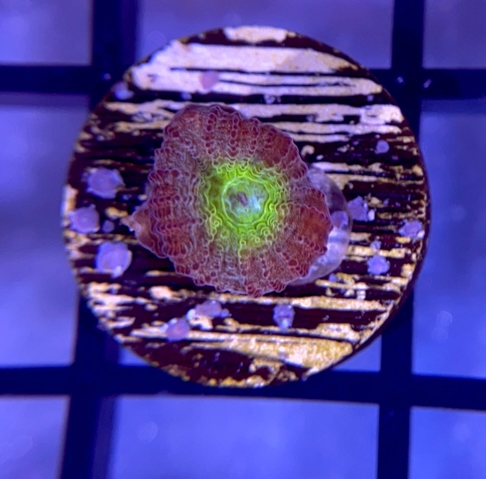 The Reef Regeneration Rainbow Road Favia is one of the nicest encrusting corals we have ever come across. This stunning piece features a baby blue mouth, outlined by neon green, yellow and then red rings. This Favia also develops grafts, some frags can develop a mainly teal outer ring.