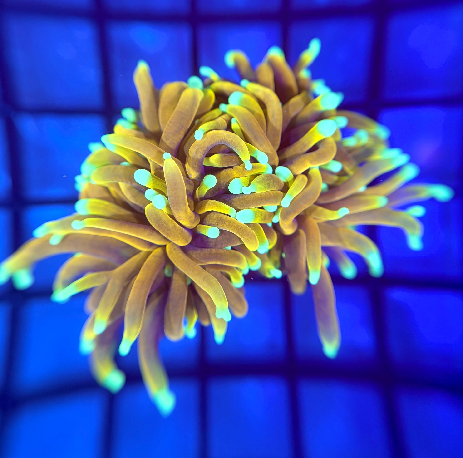 The RRG Sun God Torch is a unique piece with bright gold tentacles and cream white tips. This is a great torch that has been aquacultured for years.