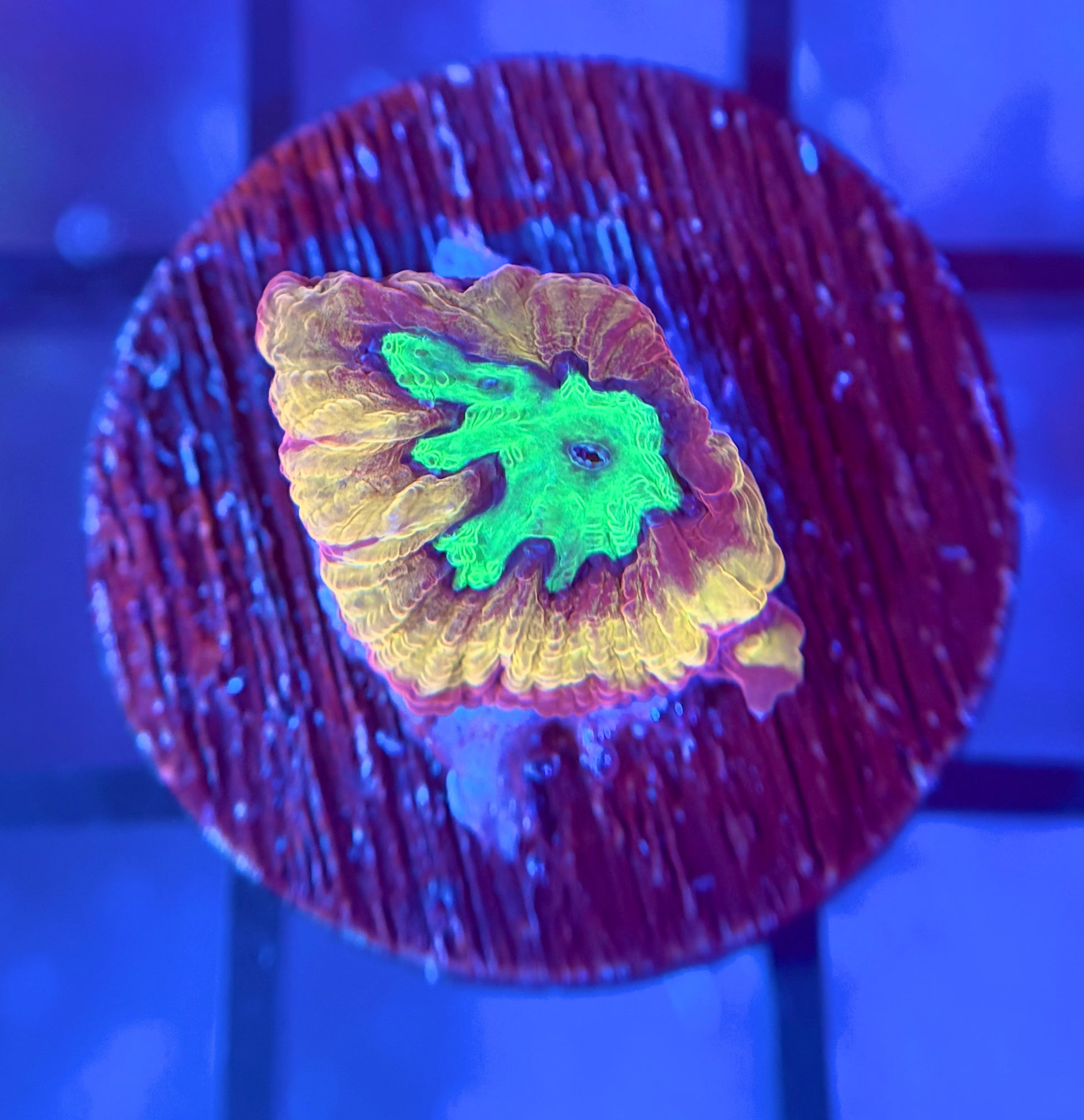The Reef Regeneration X-Men Favia is an incredible piece that looks like a mix between the Ultron Favia and the JF Gold Rush Favia. This piece has green centers surrounded by red and then gold rings. This is a beautiful favia to add to any aquarium.