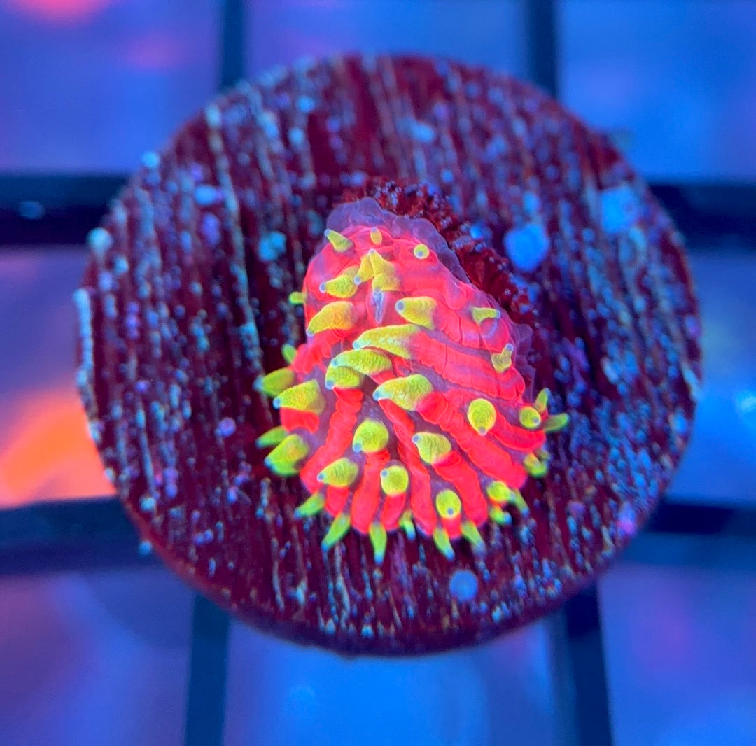 The nicest plate in the hobby, and one of the most desired corals. This insane piece has bright neon green tentacles that stand out against the bright red and purple skin.
