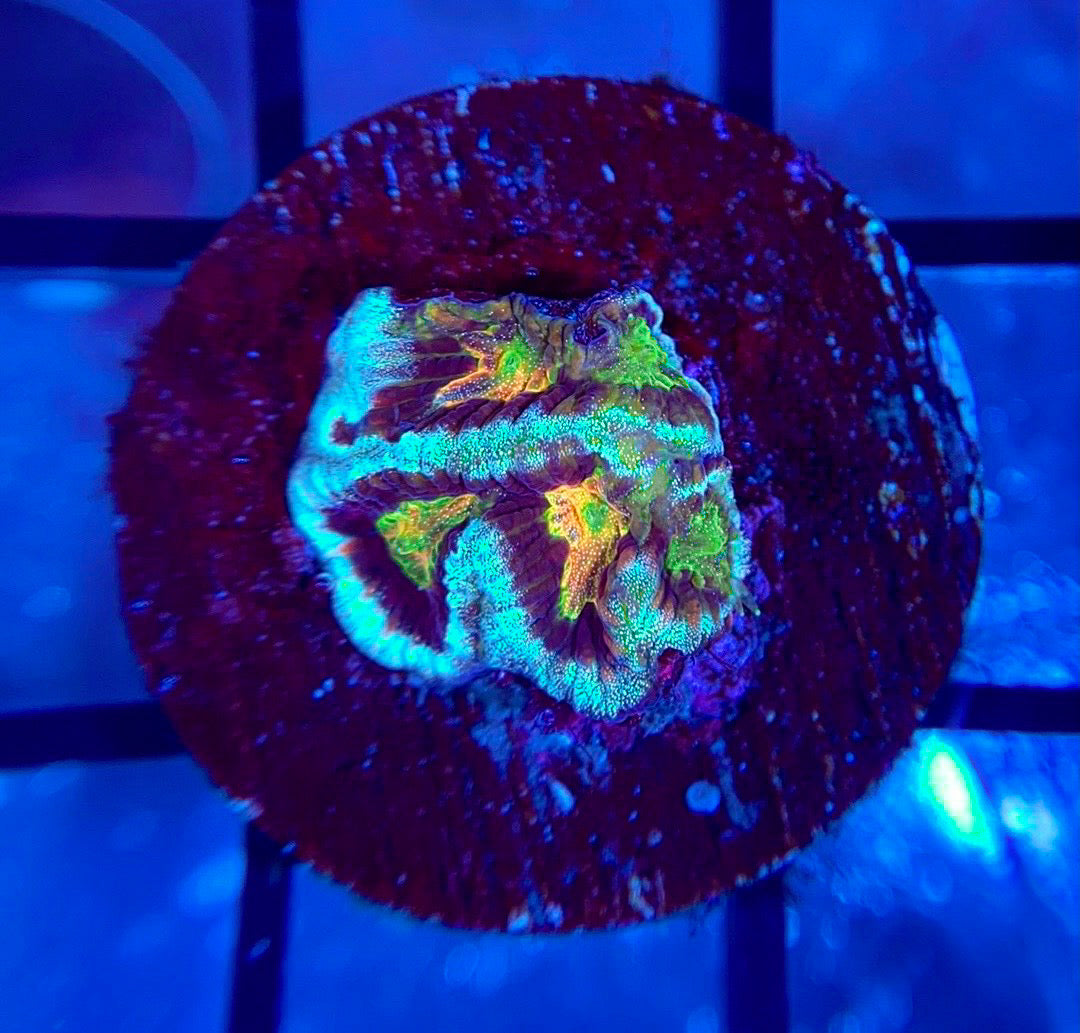 This incredibly rare Platygyra has an orange, yellow, and green center, with a purple ring and then capped by the electric sky blue rim. This is one of the rarest and slowest-growing corals in the hobby, it is a true collector piece.
