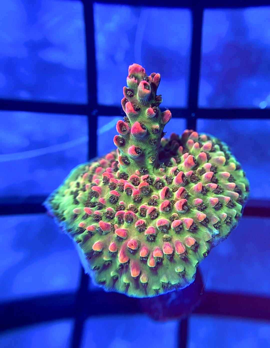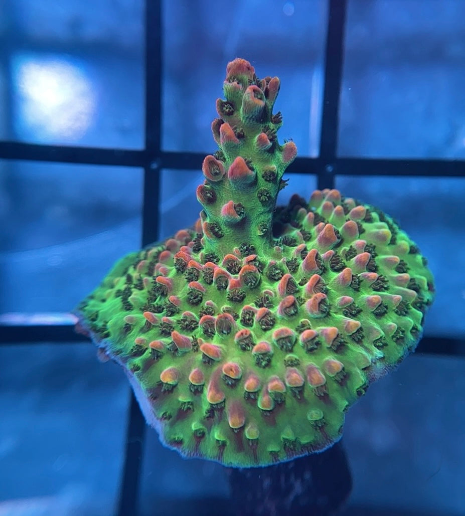 The WWC Heartbeaker is a deep green acropora with bright red polyps and corallites. In very high light this acro will become a primarily pink coral. Prefers high light and flow.