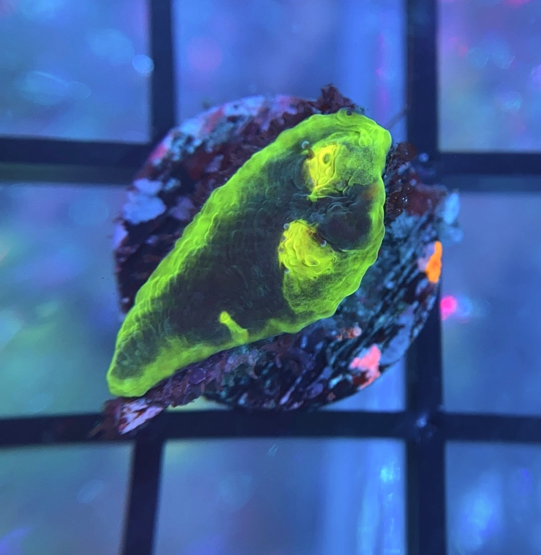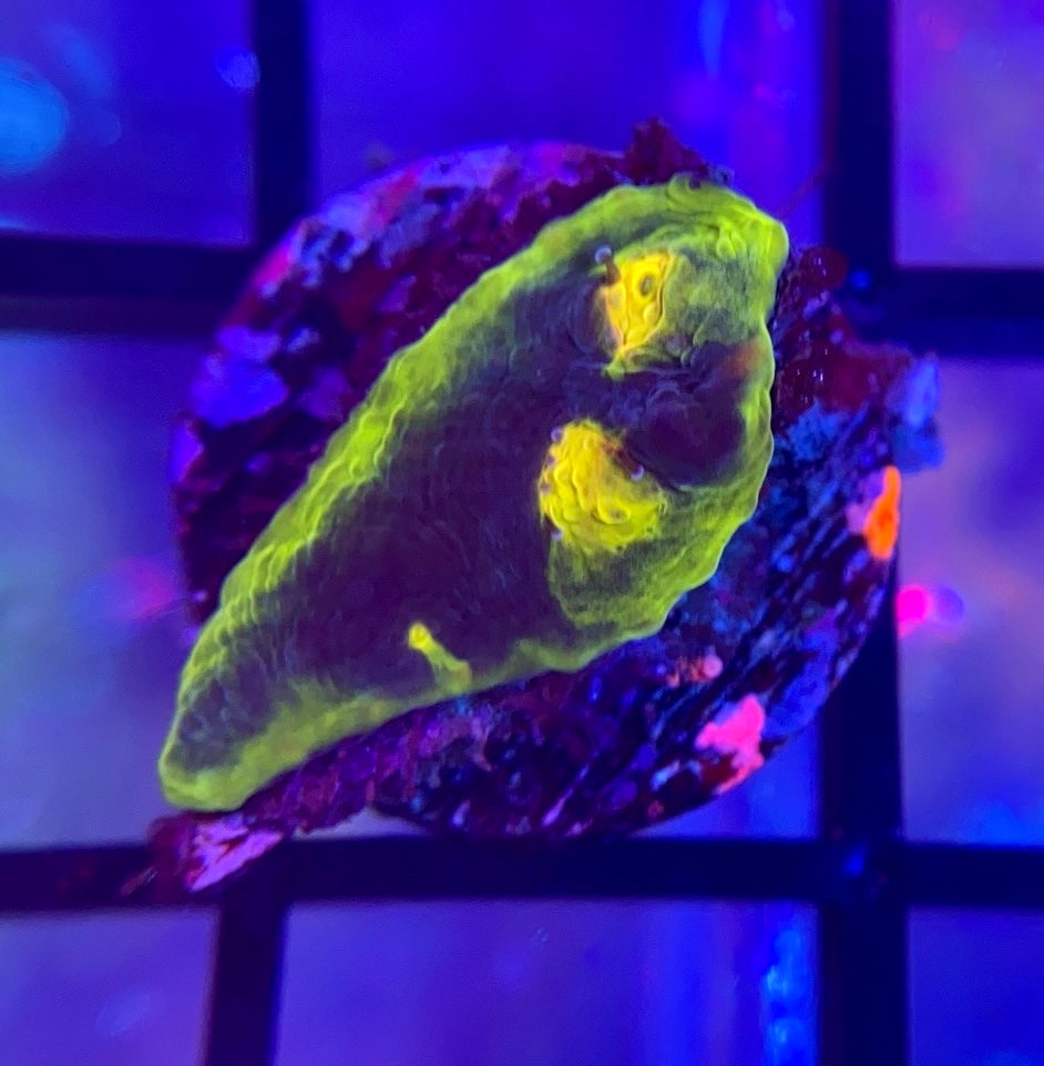 The WWC Jellybean chalice is among the nicest rainbow chalices. This piece has a green rim around the new growth, with red and blue patterns also becoming a dominant color for this coral. It is among the most desirable rainbow chalices.