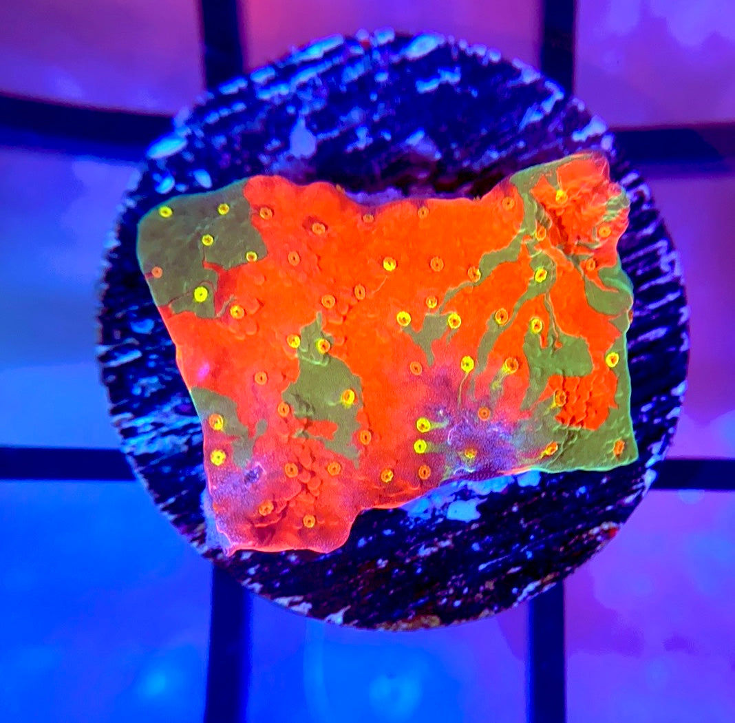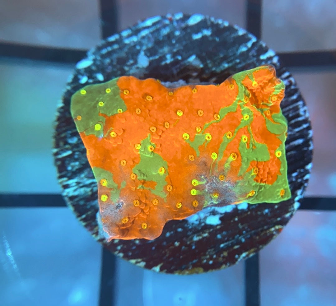 This stunning montipora is better than a normal red and green grafted monti as it has bright yellow polyps.