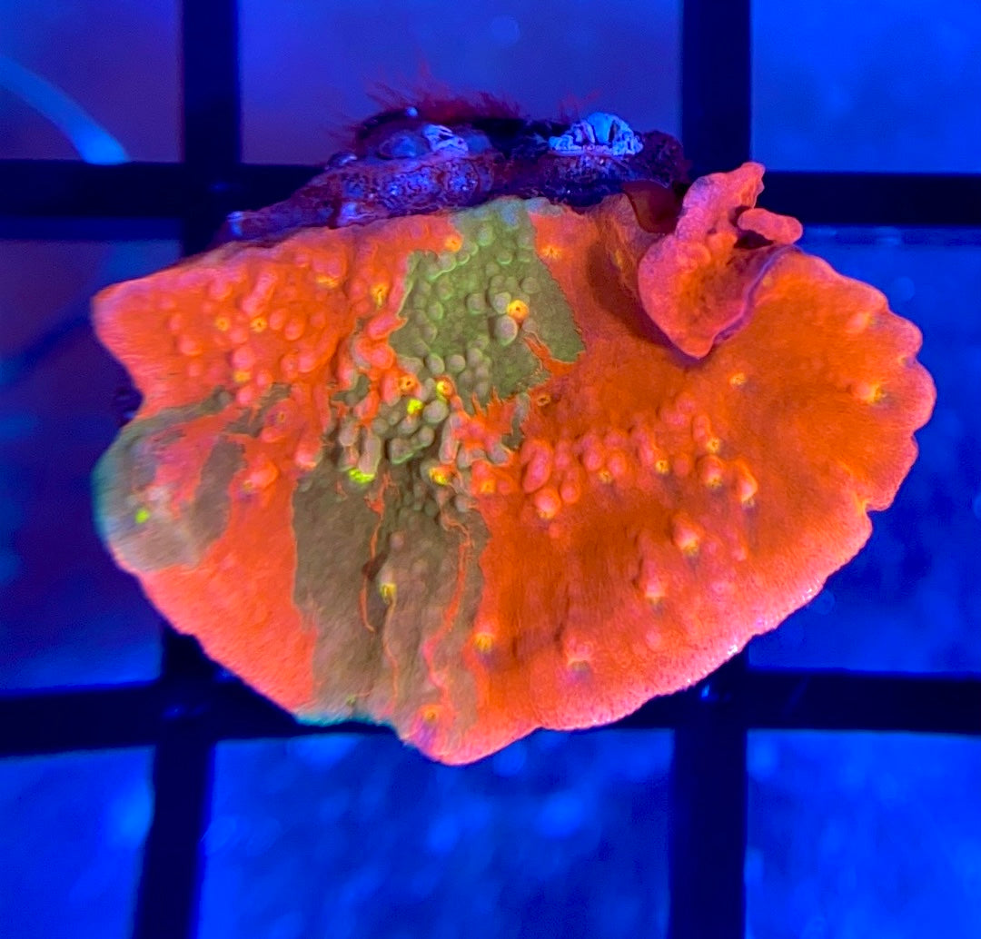 This stunning montipora is better than a normal red and green grafted monti as it has bright yellow polyps.